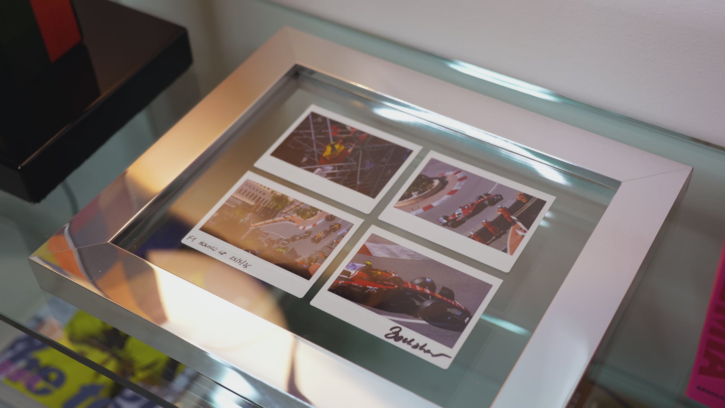 Polaroid singola inserita tra doppio vetro con cornice in base legno rivestita in acciaio specchiato, realizzata da maestro artigiano. Design elegante e curato nei dettagli.